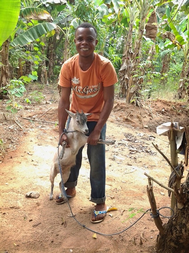 Auch der junge Mann Kwabena aus Ghana ist dankbar für seine Ziege: Vor fünf Jahren verlor seine Familie ihr ganzes Hab und Gut, als jemand ihre einfache Behausung am Stadtrand von Koforidua in Brand setzte. Seine Schwester kam dabei ums Leben und wenig später starben auch die Eltern. Nun kümmert sich Kwabena um seine drei jüngeren Geschwister, doch sie haben kaum genug. Dort wo er ein Stück Land zur Verfügung hat, baut er für die Familie Gemüse an. Nun jubelt der 24-Jährige dankbar und stolz: „Diese Ziege ist mein eigener Besitz!“