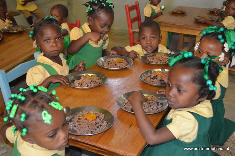 Wenn die Schulglocke läutet und die Mittagspause beginnt, versammeln sich die Kinder der La Petite Académie Schule in Lougou in Haiti mit großen Augen in einer Reihe.