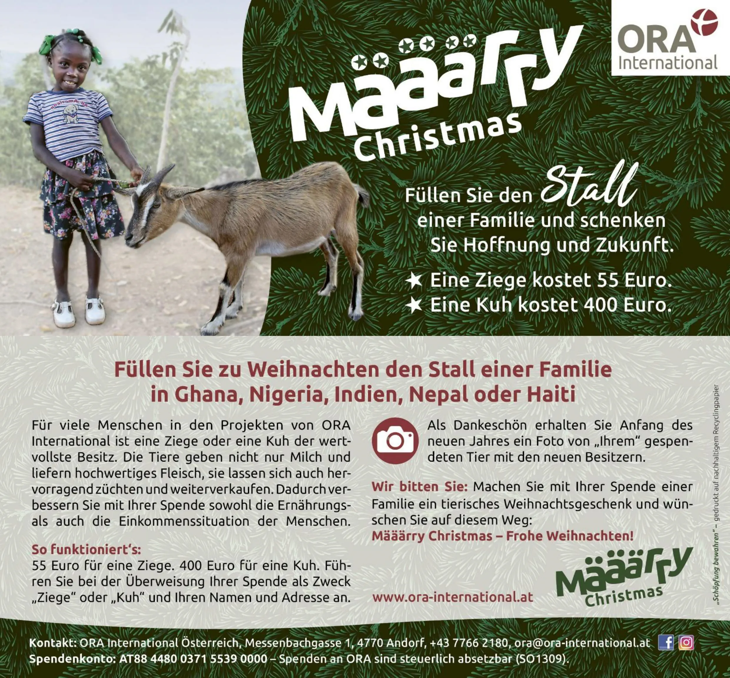 Durch Määärry Christmas erhalten bedürftige Familien in den ORA-Projektländern eine Ziege, ein Schaf oder eine Kuh, die ihre Einkommens- und Ernährungssituation nachhaltig verbessert. Eine Ziege oder ein Schaf kostet 55 Euro und ist eine tolle Idee für ein sinnvolles Weihnachtsgeschenk! Das ORA-Team stellt gerne persönliche Urkunden aus. Das Besondere: jede*r Spender*in erhält im Frühjahr ein individuelles Foto des gespendeten Tieres!