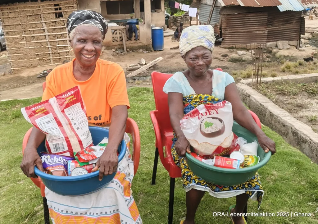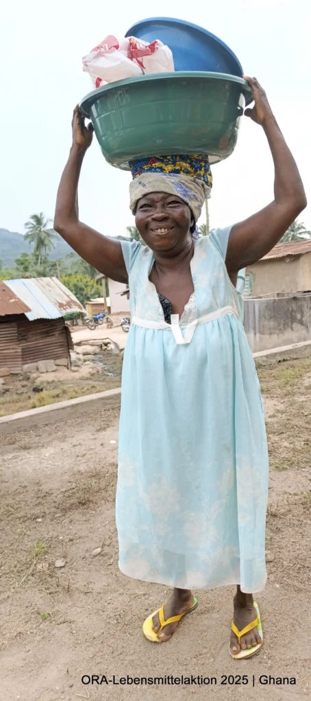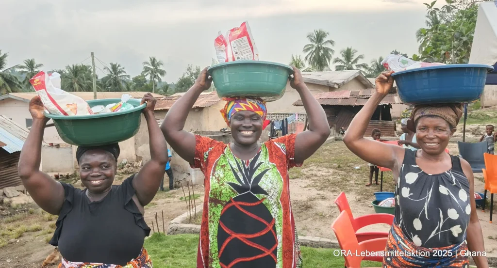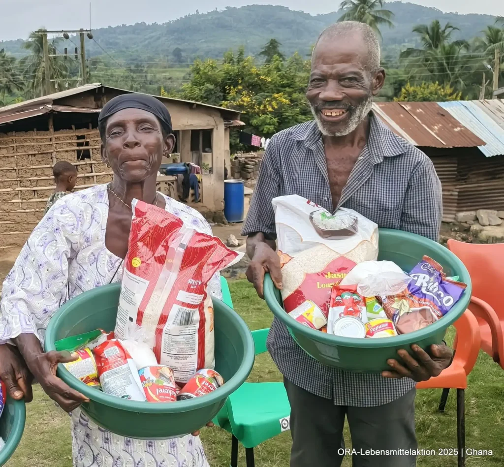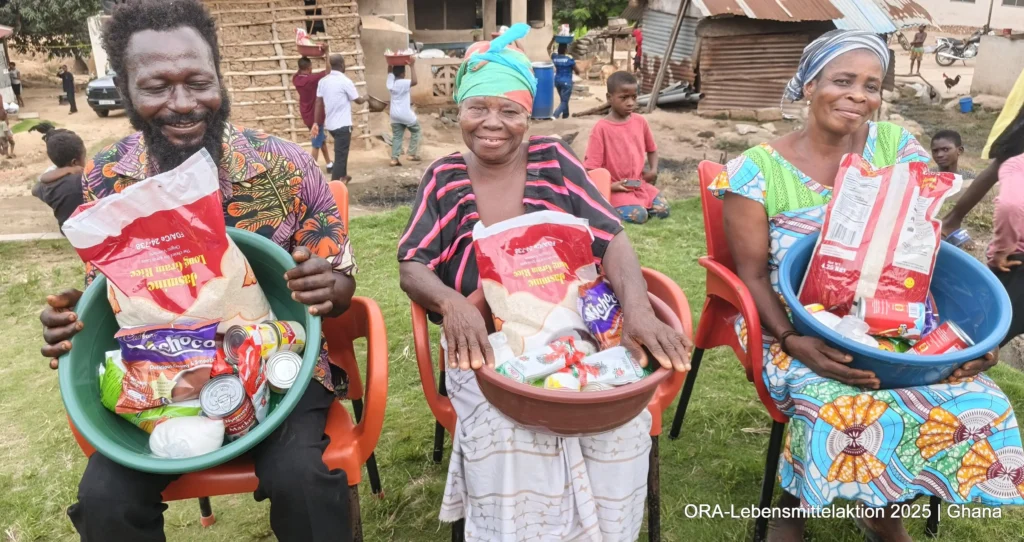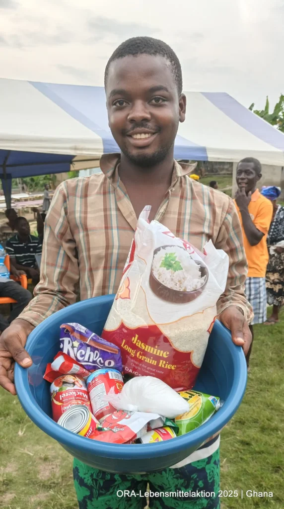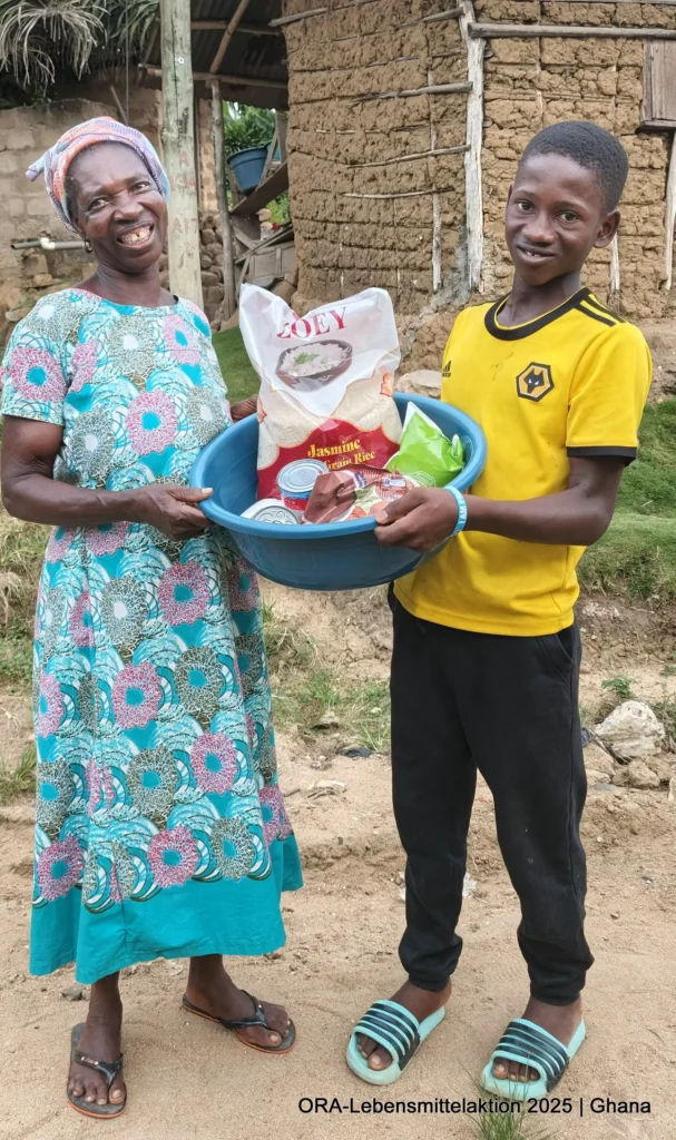 Gemeinsam mit unseren ghanaischen ORA-Projektpartnern Bernice & Paul Otoo verteilten wir insgesamt 490 Lebensmittelkörbe an Bedürftige. Pünktlich am 24. Dezember erhielten 210 Insassen aus dem Gefängnis in Koforidua neben Matratzen und Solarlampen auch Lebensmittel: „Unabhängig von den Fehlern, die ein Mensch begangen hat, bleibt seine Würde unantastbar. In Ghana reicht die staatliche Versorgung in Gefängnissen kaum für das Nötigste. Lebensmittel sind dabei keine Luxusgüter, sondern humane Grundbedürfnisse. Die Aktion schenkte den Menschen Hoffnung, Würde und das Gefühl, gerade zur Weihnachtszeit nicht vergessen zu sein“, schildet Bernice.